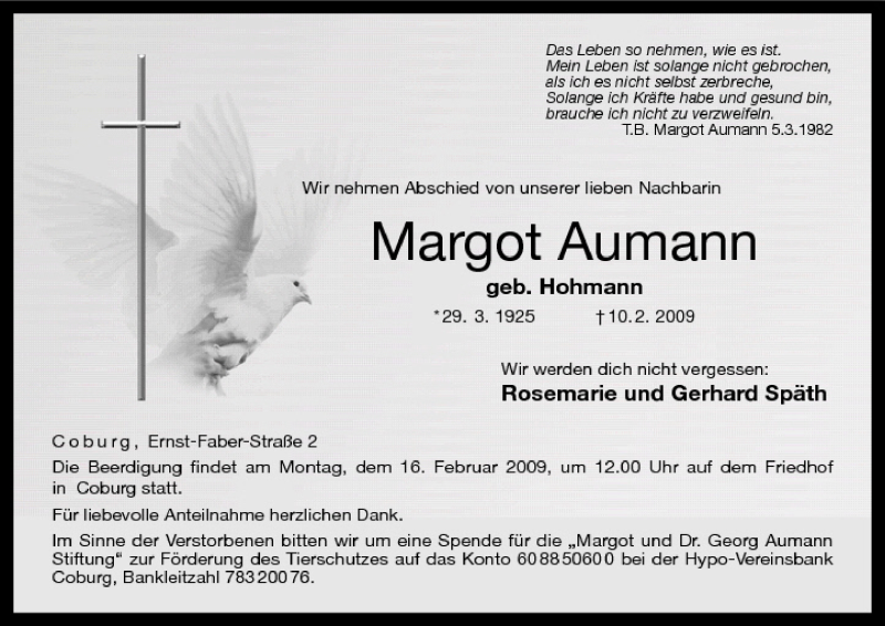 Hier finden Sie alle Traueranzeigen aus der Zeitung, die bisher für Margot Aumann erschienen sind. Weitere Traueranzeigen, die in der Zeitung erscheinen, werden hier ebenfalls aufgelistet