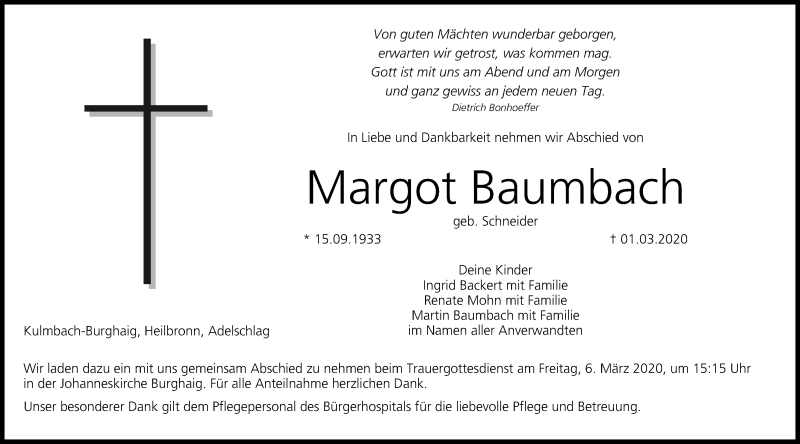 Hier finden Sie alle Traueranzeigen aus der Zeitung, die bisher für Margot Baumbach erschienen sind. Weitere Traueranzeigen, die in der Zeitung erscheinen, werden hier ebenfalls aufgelistet