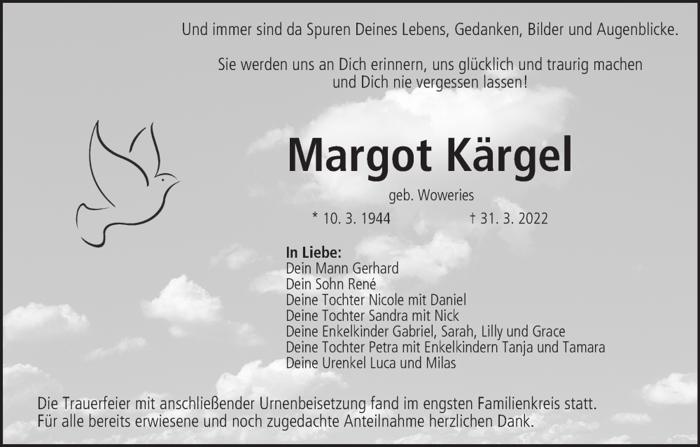 Hier finden Sie alle Traueranzeigen aus der Zeitung, die bisher für Margot Kärgel erschienen sind. Weitere Traueranzeigen, die in der Zeitung erscheinen, werden hier ebenfalls aufgelistet