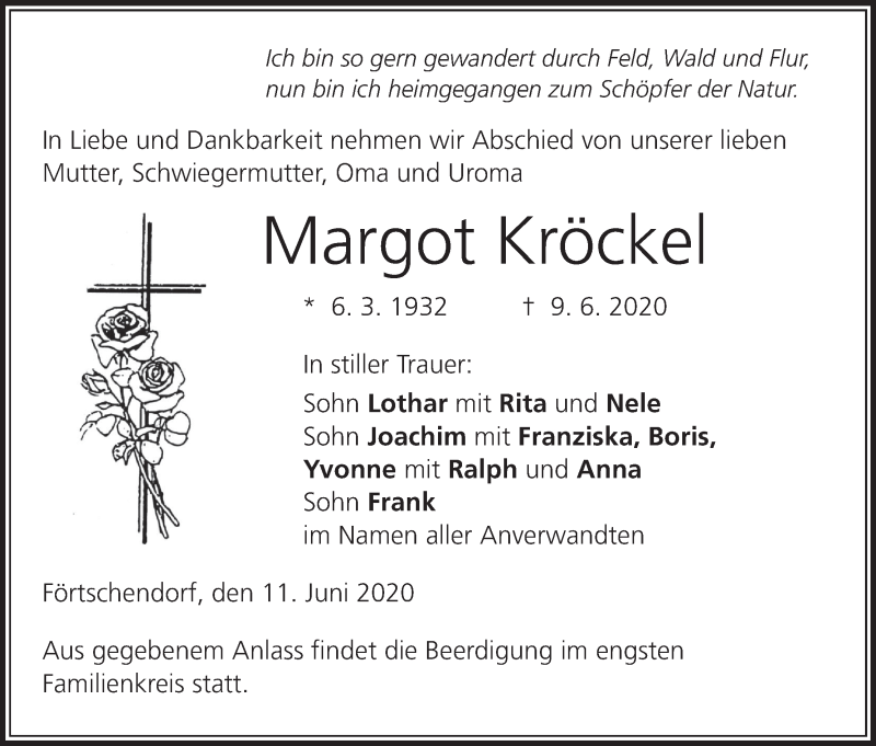 Hier finden Sie alle Traueranzeigen aus der Zeitung, die bisher für Margot Kröckel erschienen sind. Weitere Traueranzeigen, die in der Zeitung erscheinen, werden hier ebenfalls aufgelistet