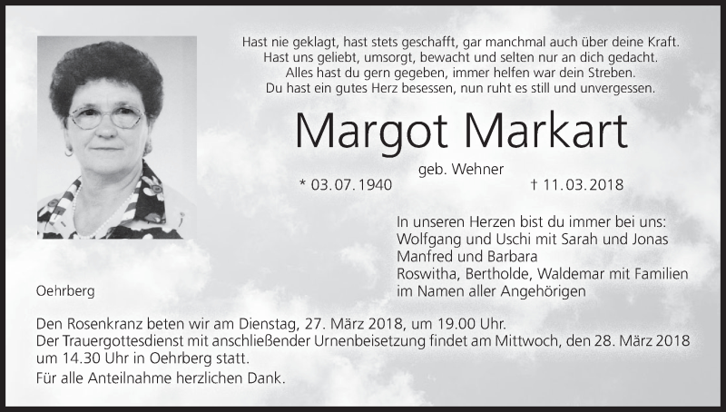 Hier finden Sie alle Traueranzeigen aus der Zeitung, die bisher für Margot Markart erschienen sind. Weitere Traueranzeigen, die in der Zeitung erscheinen, werden hier ebenfalls aufgelistet