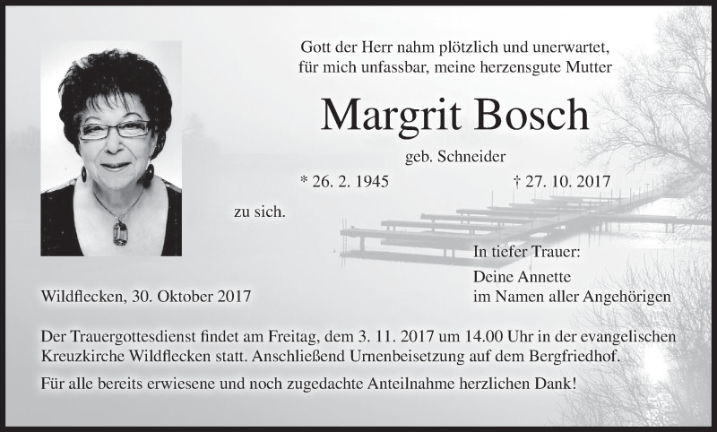 Hier finden Sie alle Traueranzeigen aus der Zeitung, die bisher für Margrit Bosch erschienen sind. Weitere Traueranzeigen, die in der Zeitung erscheinen, werden hier ebenfalls aufgelistet
