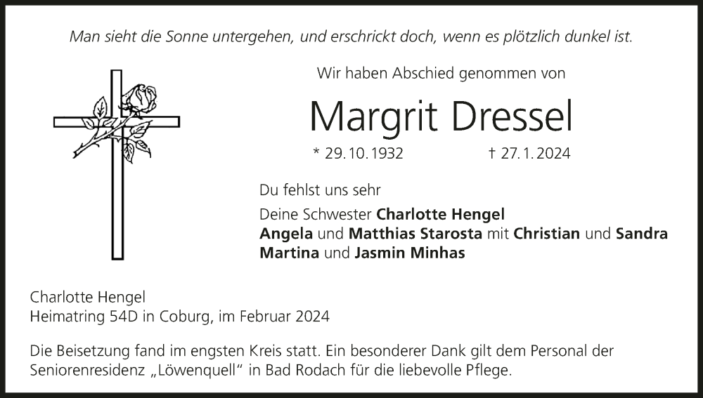 Hier finden Sie alle Traueranzeigen aus der Zeitung, die bisher für Margrit Dressel erschienen sind. Weitere Traueranzeigen, die in der Zeitung erscheinen, werden hier ebenfalls aufgelistet