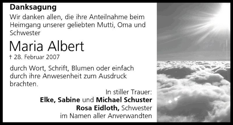 Hier finden Sie alle Traueranzeigen aus der Zeitung, die bisher für Maria Albert erschienen sind. Weitere Traueranzeigen, die in der Zeitung erscheinen, werden hier ebenfalls aufgelistet