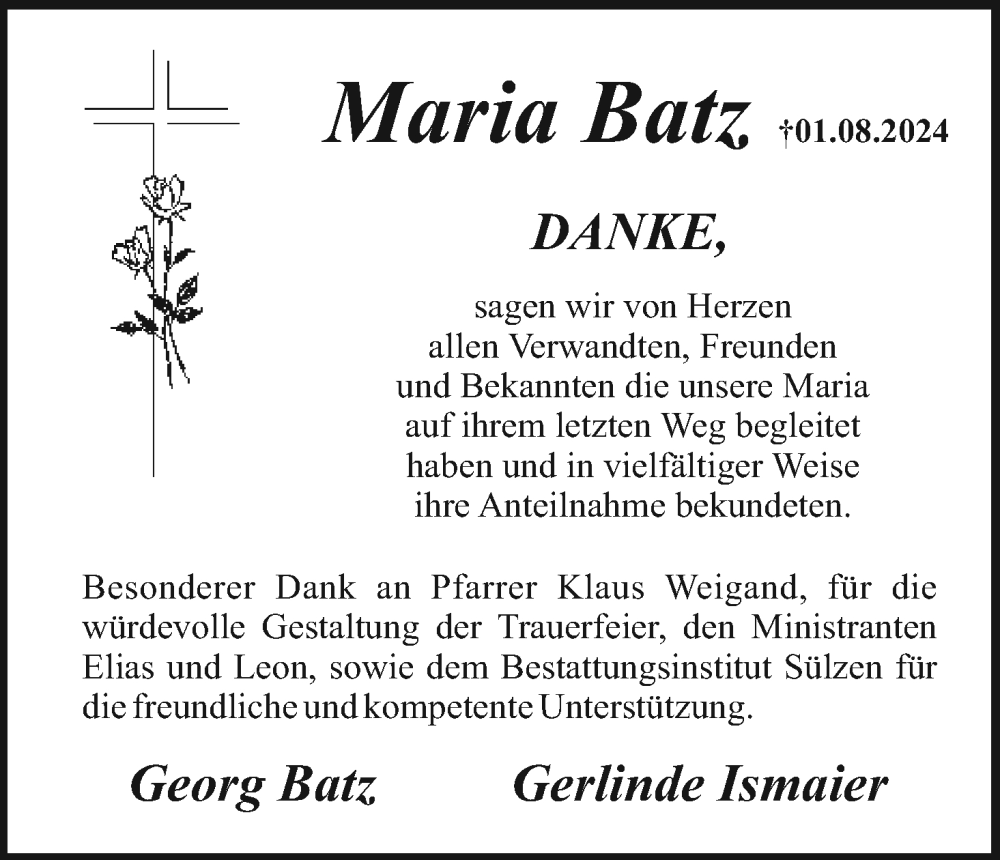 Hier finden Sie alle Traueranzeigen aus der Zeitung, die bisher für Maria Batz erschienen sind. Weitere Traueranzeigen, die in der Zeitung erscheinen, werden hier ebenfalls aufgelistet