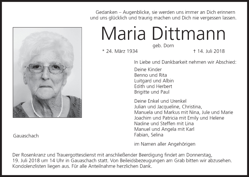 Hier finden Sie alle Traueranzeigen aus der Zeitung, die bisher für Maria Dittmann erschienen sind. Weitere Traueranzeigen, die in der Zeitung erscheinen, werden hier ebenfalls aufgelistet