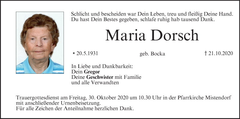 Hier finden Sie alle Traueranzeigen aus der Zeitung, die bisher für Maria Dorsch erschienen sind. Weitere Traueranzeigen, die in der Zeitung erscheinen, werden hier ebenfalls aufgelistet