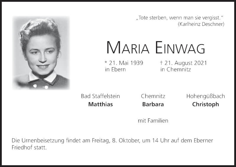 Hier finden Sie alle Traueranzeigen aus der Zeitung, die bisher für Maria Einwang erschienen sind. Weitere Traueranzeigen, die in der Zeitung erscheinen, werden hier ebenfalls aufgelistet