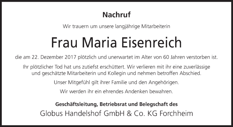 Hier finden Sie alle Traueranzeigen aus der Zeitung, die bisher für Maria Eisenreich erschienen sind. Weitere Traueranzeigen, die in der Zeitung erscheinen, werden hier ebenfalls aufgelistet