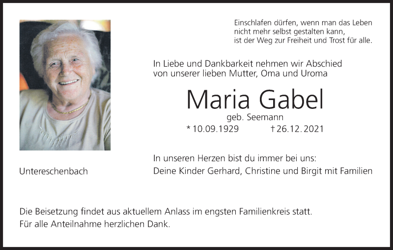 Hier finden Sie alle Traueranzeigen aus der Zeitung, die bisher für Maria Gabel erschienen sind. Weitere Traueranzeigen, die in der Zeitung erscheinen, werden hier ebenfalls aufgelistet