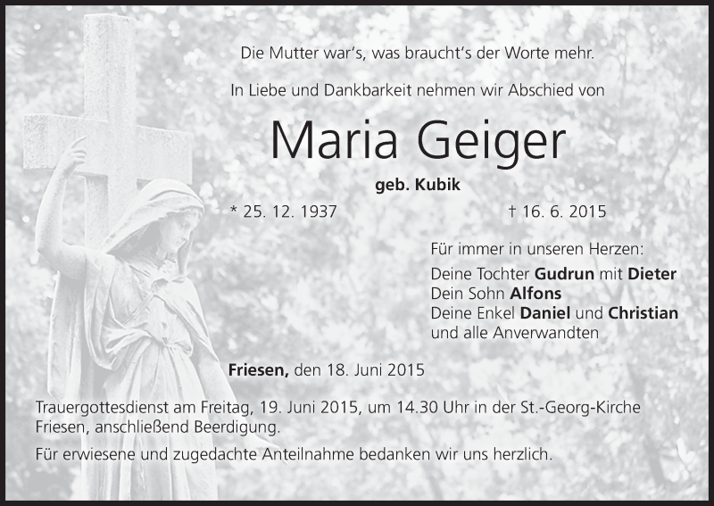 Hier finden Sie alle Traueranzeigen aus der Zeitung, die bisher für Maria Geiger erschienen sind. Weitere Traueranzeigen, die in der Zeitung erscheinen, werden hier ebenfalls aufgelistet