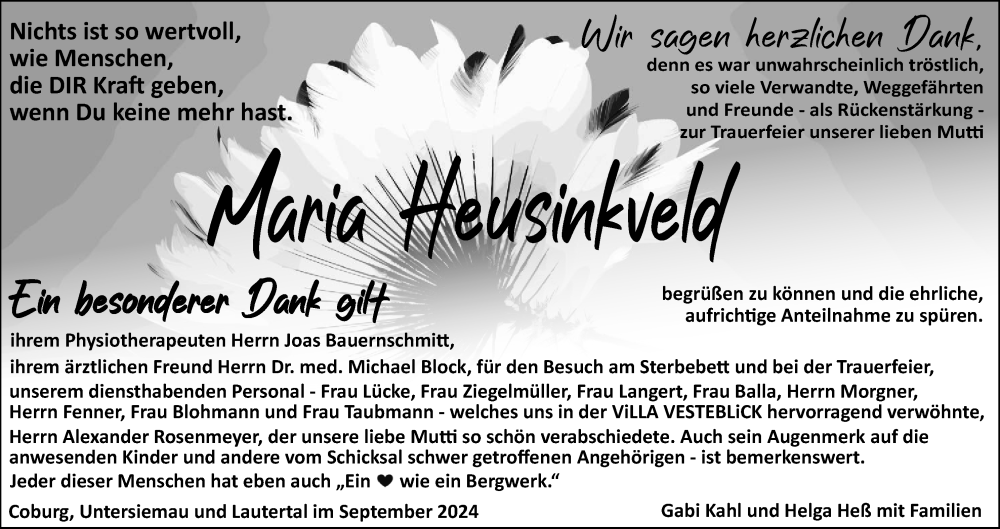 Hier finden Sie alle Traueranzeigen aus der Zeitung, die bisher für Maria Heusinkveld erschienen sind. Weitere Traueranzeigen, die in der Zeitung erscheinen, werden hier ebenfalls aufgelistet