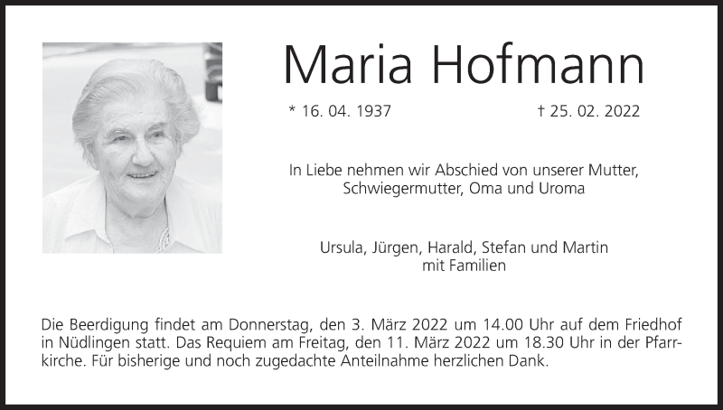 Hier finden Sie alle Traueranzeigen aus der Zeitung, die bisher für Maria Hofmann erschienen sind. Weitere Traueranzeigen, die in der Zeitung erscheinen, werden hier ebenfalls aufgelistet