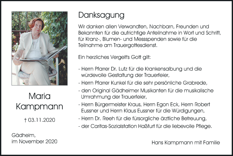 Hier finden Sie alle Traueranzeigen aus der Zeitung, die bisher für Maria Kampmann erschienen sind. Weitere Traueranzeigen, die in der Zeitung erscheinen, werden hier ebenfalls aufgelistet