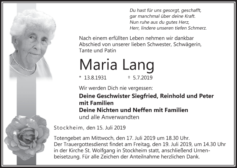 Hier finden Sie alle Traueranzeigen aus der Zeitung, die bisher für Maria Lang erschienen sind. Weitere Traueranzeigen, die in der Zeitung erscheinen, werden hier ebenfalls aufgelistet