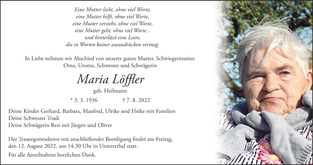 Hier finden Sie alle Traueranzeigen aus der Zeitung, die bisher für Maria Löffler erschienen sind. Weitere Traueranzeigen, die in der Zeitung erscheinen, werden hier ebenfalls aufgelistet