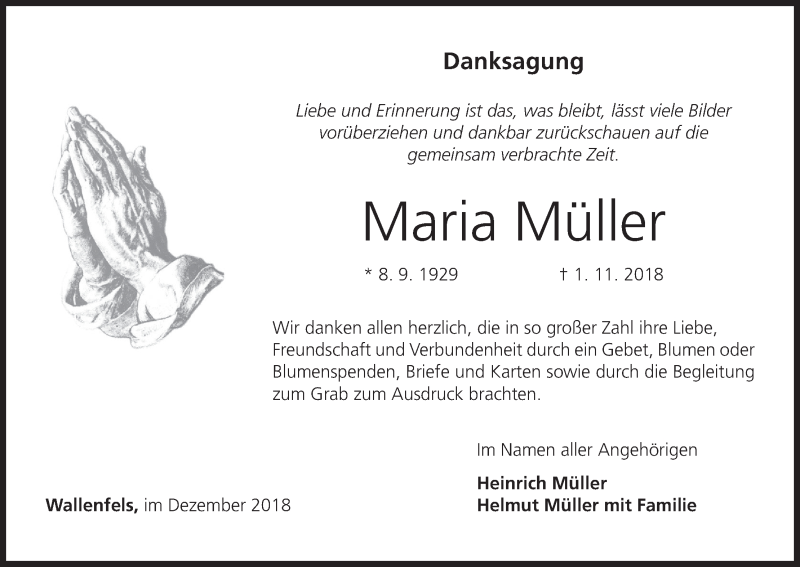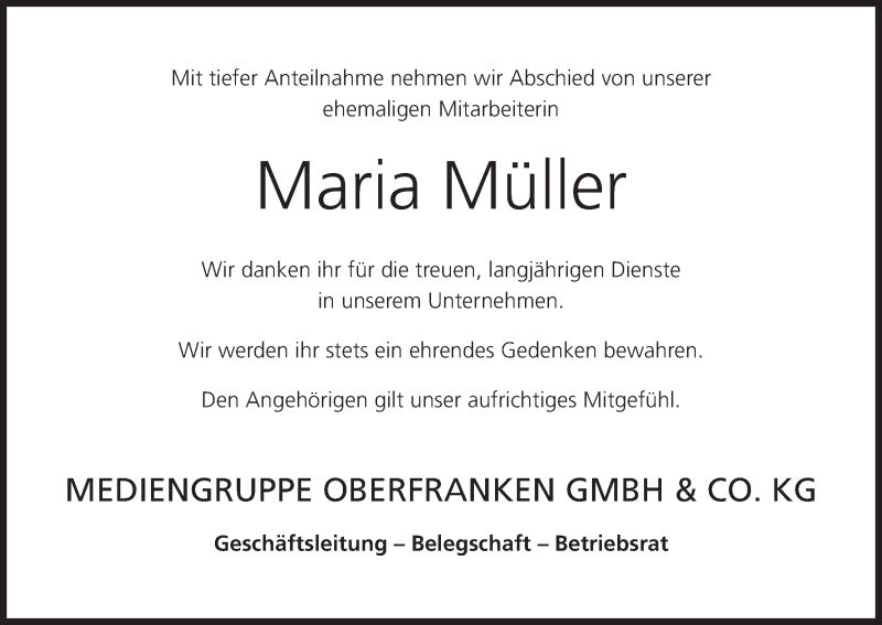 Hier finden Sie alle Traueranzeigen aus der Zeitung, die bisher für Maria Müller erschienen sind. Weitere Traueranzeigen, die in der Zeitung erscheinen, werden hier ebenfalls aufgelistet