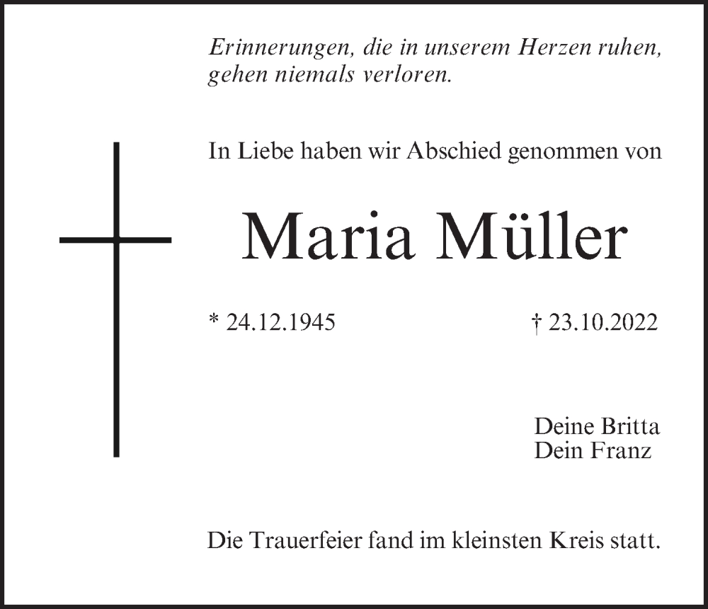 Hier finden Sie alle Traueranzeigen aus der Zeitung, die bisher für Maria Müller erschienen sind. Weitere Traueranzeigen, die in der Zeitung erscheinen, werden hier ebenfalls aufgelistet