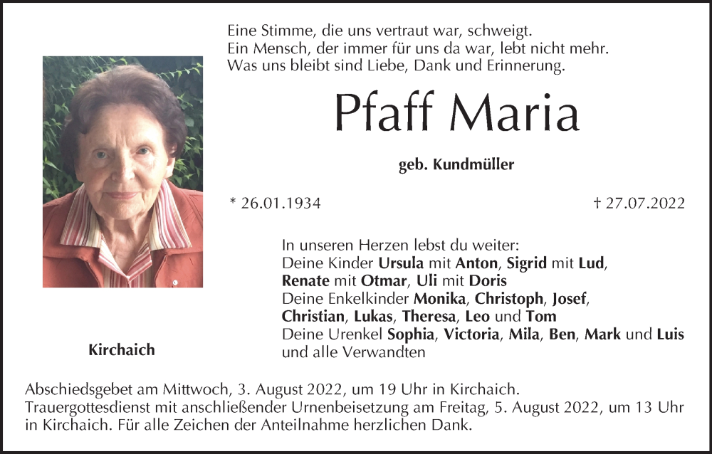 Hier finden Sie alle Traueranzeigen aus der Zeitung, die bisher für Maria Pfaff erschienen sind. Weitere Traueranzeigen, die in der Zeitung erscheinen, werden hier ebenfalls aufgelistet