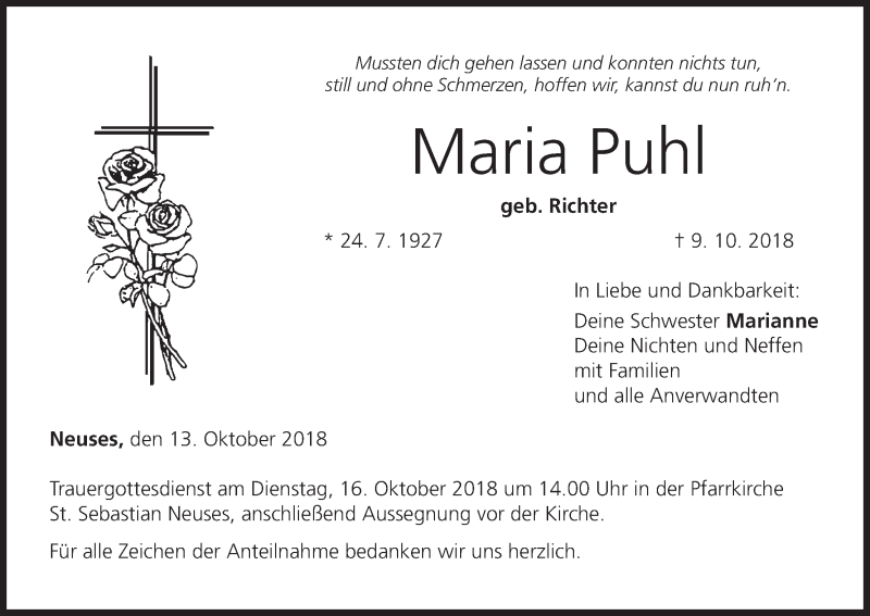 Hier finden Sie alle Traueranzeigen aus der Zeitung, die bisher für Maria Puhl erschienen sind. Weitere Traueranzeigen, die in der Zeitung erscheinen, werden hier ebenfalls aufgelistet