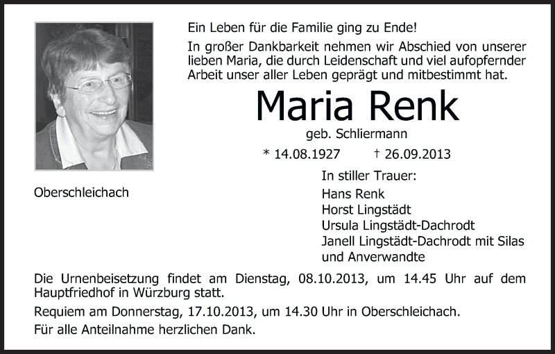 Hier finden Sie alle Traueranzeigen aus der Zeitung, die bisher für Maria Renk erschienen sind. Weitere Traueranzeigen, die in der Zeitung erscheinen, werden hier ebenfalls aufgelistet