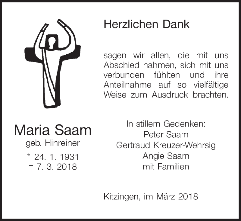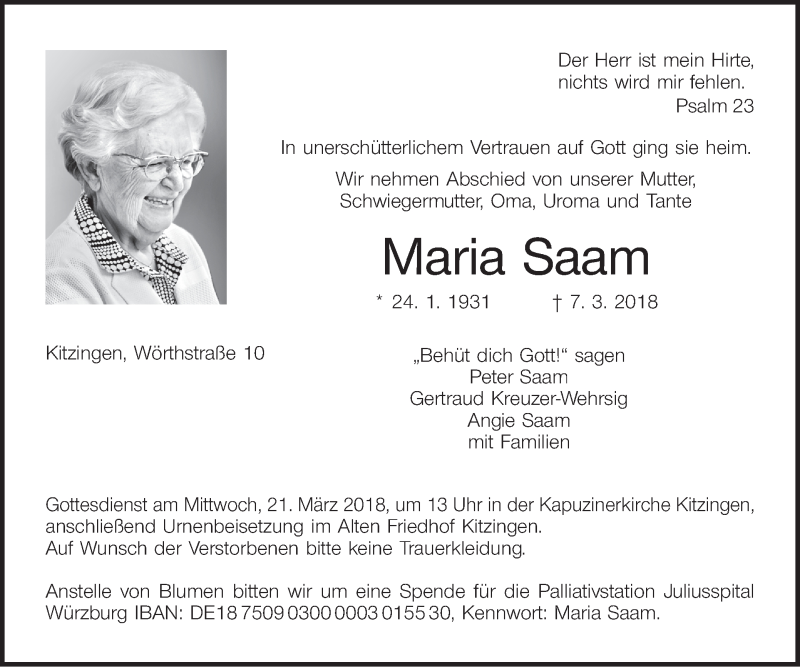 Hier finden Sie alle Traueranzeigen aus der Zeitung, die bisher für Maria Saam erschienen sind. Weitere Traueranzeigen, die in der Zeitung erscheinen, werden hier ebenfalls aufgelistet