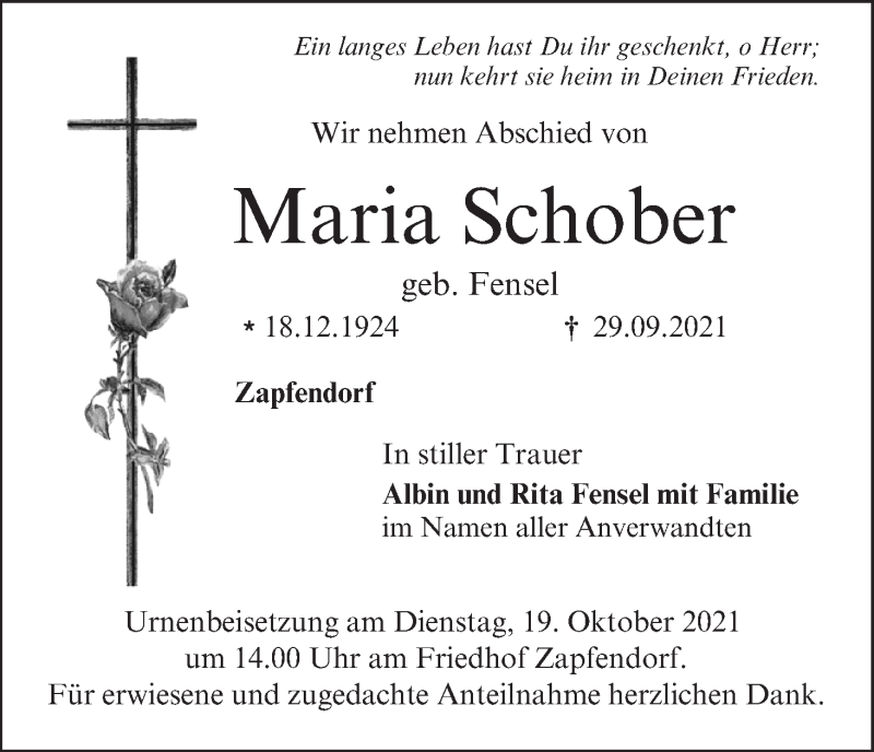 Hier finden Sie alle Traueranzeigen aus der Zeitung, die bisher für Maria Schober erschienen sind. Weitere Traueranzeigen, die in der Zeitung erscheinen, werden hier ebenfalls aufgelistet