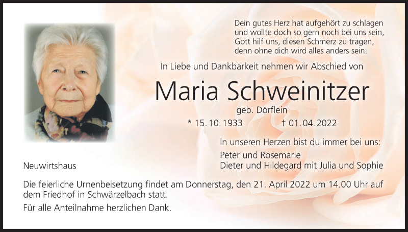 Hier finden Sie alle Traueranzeigen aus der Zeitung, die bisher für Maria Schweinitzer erschienen sind. Weitere Traueranzeigen, die in der Zeitung erscheinen, werden hier ebenfalls aufgelistet