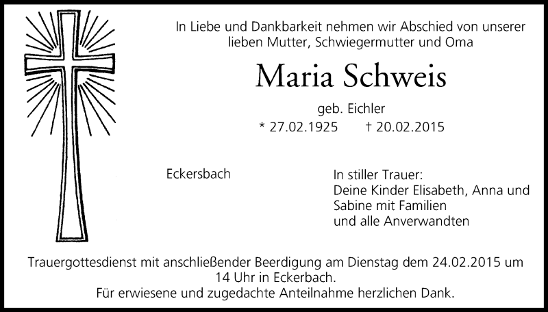 Hier finden Sie alle Traueranzeigen aus der Zeitung, die bisher für Maria Schweis erschienen sind. Weitere Traueranzeigen, die in der Zeitung erscheinen, werden hier ebenfalls aufgelistet