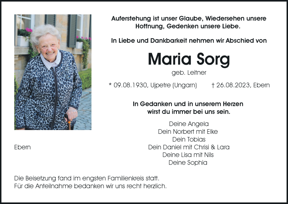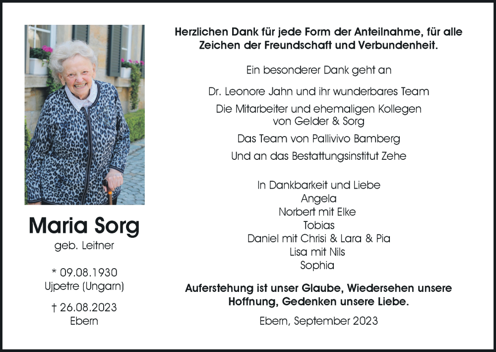 Hier finden Sie alle Traueranzeigen aus der Zeitung, die bisher für Maria Sorg erschienen sind. Weitere Traueranzeigen, die in der Zeitung erscheinen, werden hier ebenfalls aufgelistet