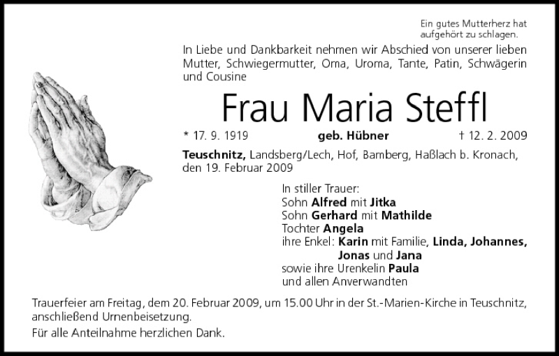 Hier finden Sie alle Traueranzeigen aus der Zeitung, die bisher für Maria Steffl erschienen sind. Weitere Traueranzeigen, die in der Zeitung erscheinen, werden hier ebenfalls aufgelistet
