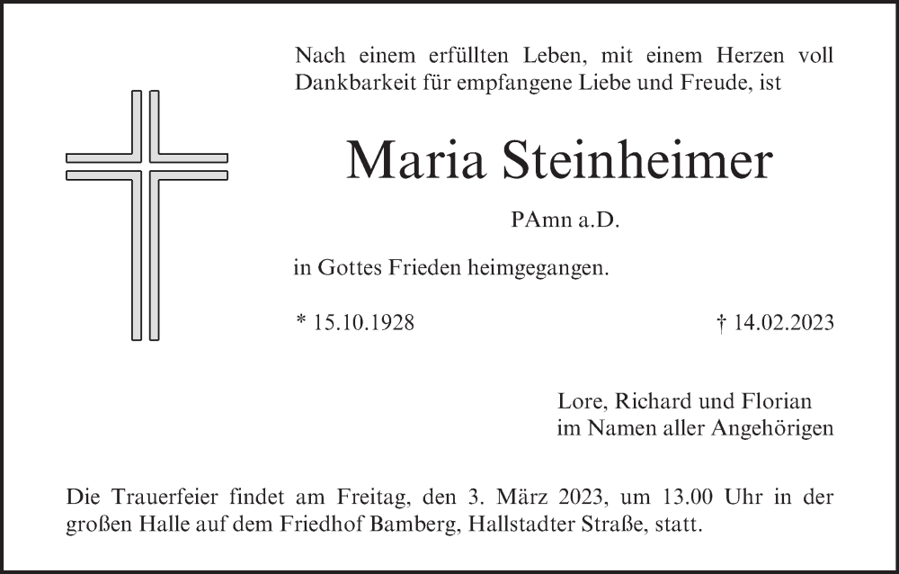 Hier finden Sie alle Traueranzeigen aus der Zeitung, die bisher für Maria Steinheimer erschienen sind. Weitere Traueranzeigen, die in der Zeitung erscheinen, werden hier ebenfalls aufgelistet