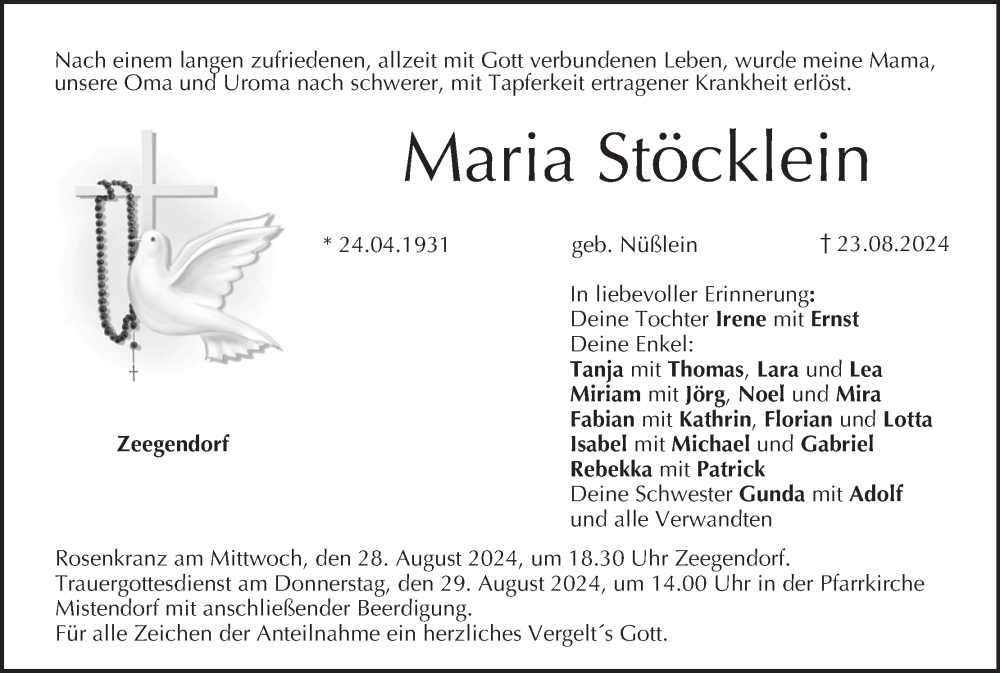 Hier finden Sie alle Traueranzeigen aus der Zeitung, die bisher für Maria Stöcklein erschienen sind. Weitere Traueranzeigen, die in der Zeitung erscheinen, werden hier ebenfalls aufgelistet