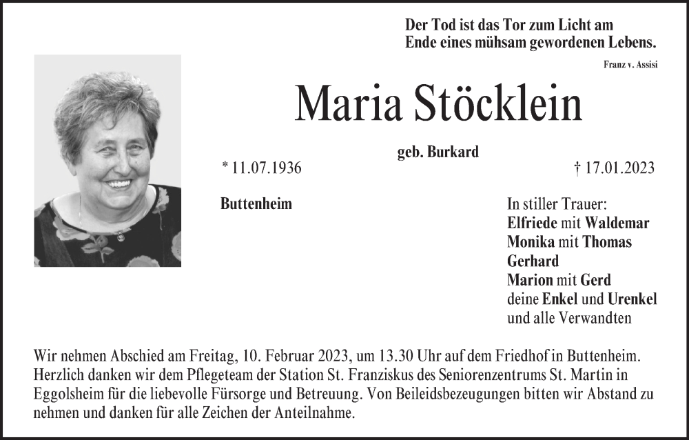 Hier finden Sie alle Traueranzeigen aus der Zeitung, die bisher für Maria Stöcklein erschienen sind. Weitere Traueranzeigen, die in der Zeitung erscheinen, werden hier ebenfalls aufgelistet