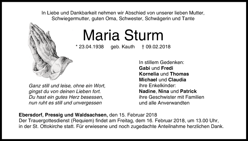Hier finden Sie alle Traueranzeigen aus der Zeitung, die bisher für Maria Sturm erschienen sind. Weitere Traueranzeigen, die in der Zeitung erscheinen, werden hier ebenfalls aufgelistet