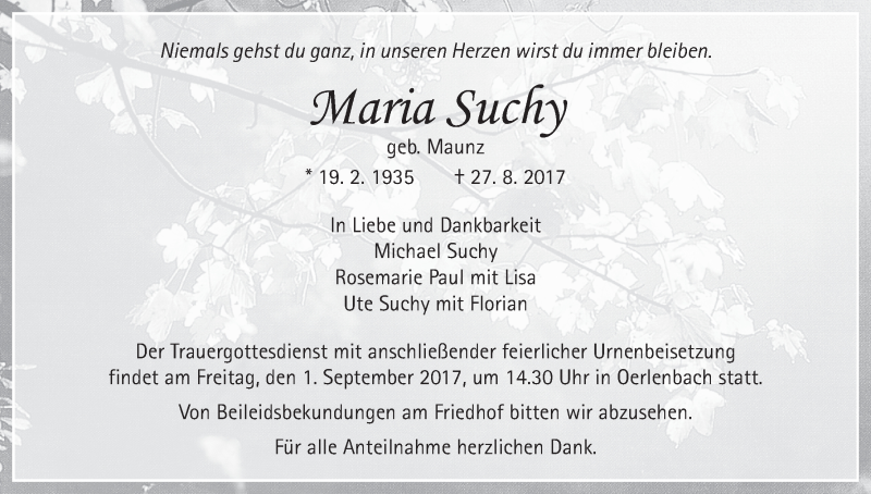 Hier finden Sie alle Traueranzeigen aus der Zeitung, die bisher für Maria Suchy erschienen sind. Weitere Traueranzeigen, die in der Zeitung erscheinen, werden hier ebenfalls aufgelistet
