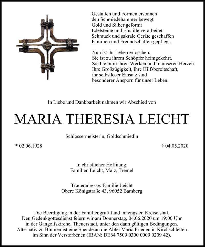 Hier finden Sie alle Traueranzeigen aus der Zeitung, die bisher für Maria Theresia Leicht erschienen sind. Weitere Traueranzeigen, die in der Zeitung erscheinen, werden hier ebenfalls aufgelistet