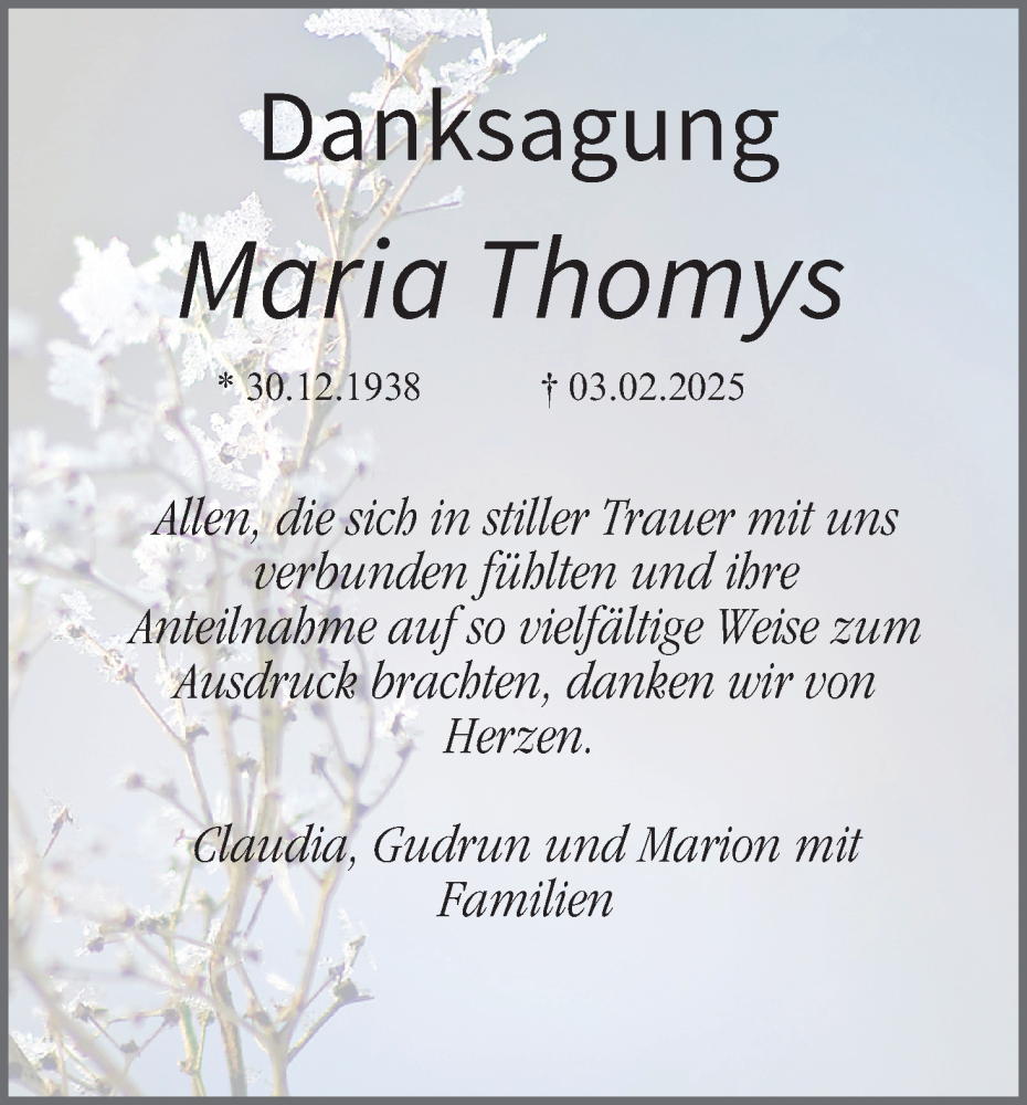Hier finden Sie alle Traueranzeigen aus der Zeitung, die bisher für Maria Thomys erschienen sind. Weitere Traueranzeigen, die in der Zeitung erscheinen, werden hier ebenfalls aufgelistet