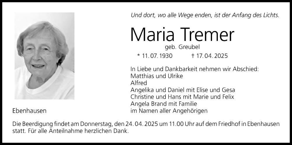 Hier finden Sie alle Traueranzeigen aus der Zeitung, die bisher für Maria Tremer erschienen sind. Weitere Traueranzeigen, die in der Zeitung erscheinen, werden hier ebenfalls aufgelistet