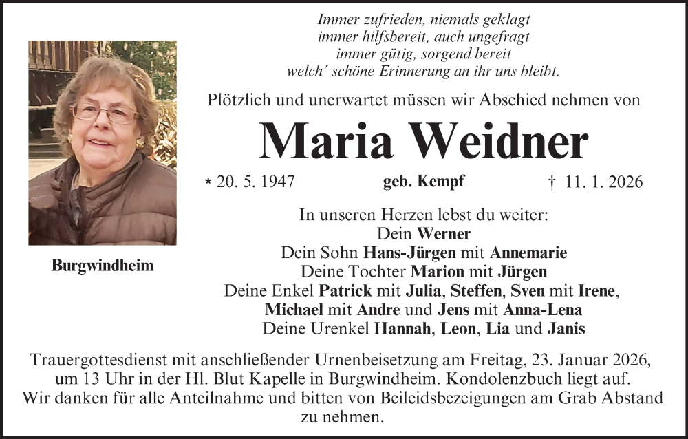 Hier finden Sie alle Traueranzeigen aus der Zeitung, die bisher für Maria Weidner erschienen sind. Weitere Traueranzeigen, die in der Zeitung erscheinen, werden hier ebenfalls aufgelistet