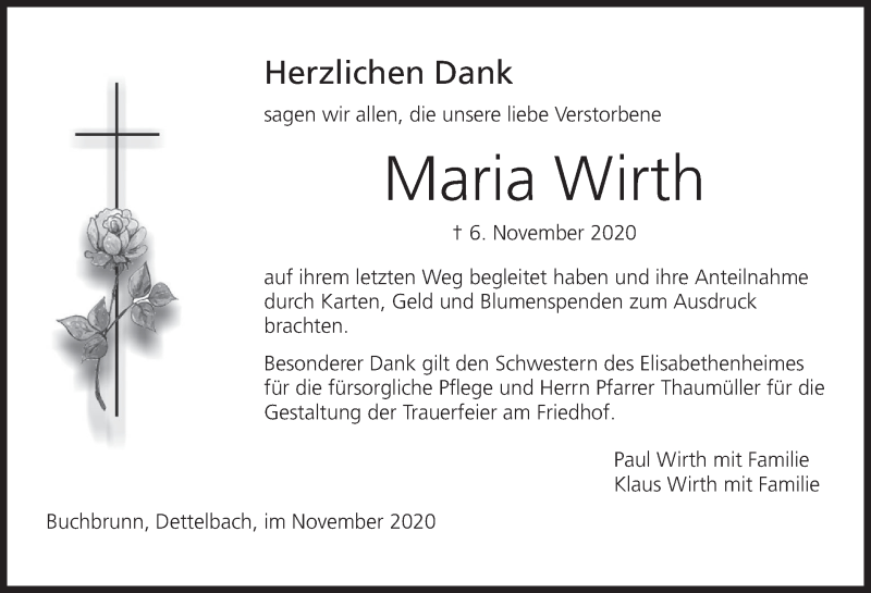 Hier finden Sie alle Traueranzeigen aus der Zeitung, die bisher für Maria Wirth erschienen sind. Weitere Traueranzeigen, die in der Zeitung erscheinen, werden hier ebenfalls aufgelistet