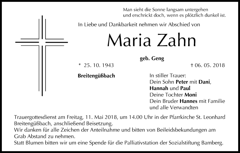 Hier finden Sie alle Traueranzeigen aus der Zeitung, die bisher für Maria Zahn erschienen sind. Weitere Traueranzeigen, die in der Zeitung erscheinen, werden hier ebenfalls aufgelistet