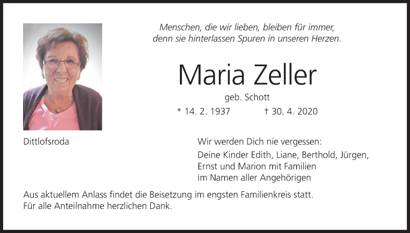 Hier finden Sie alle Traueranzeigen aus der Zeitung, die bisher für Maria Zeller erschienen sind. Weitere Traueranzeigen, die in der Zeitung erscheinen, werden hier ebenfalls aufgelistet