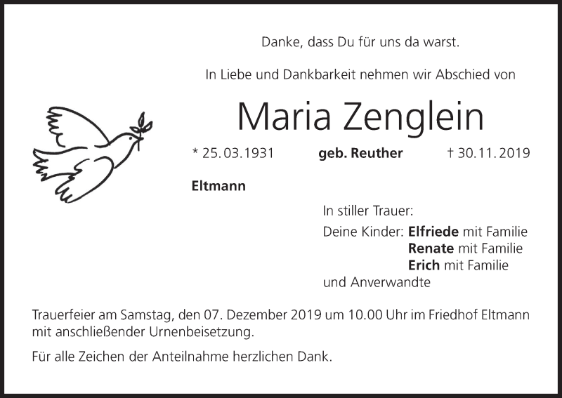 Hier finden Sie alle Traueranzeigen aus der Zeitung, die bisher für Maria Zenglein erschienen sind. Weitere Traueranzeigen, die in der Zeitung erscheinen, werden hier ebenfalls aufgelistet