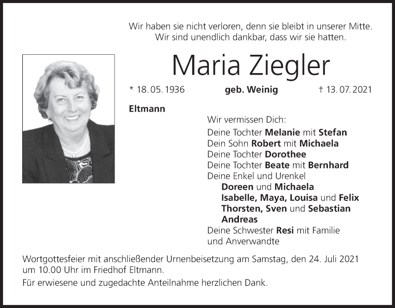 Hier finden Sie alle Traueranzeigen aus der Zeitung, die bisher für Maria Ziegler erschienen sind. Weitere Traueranzeigen, die in der Zeitung erscheinen, werden hier ebenfalls aufgelistet
