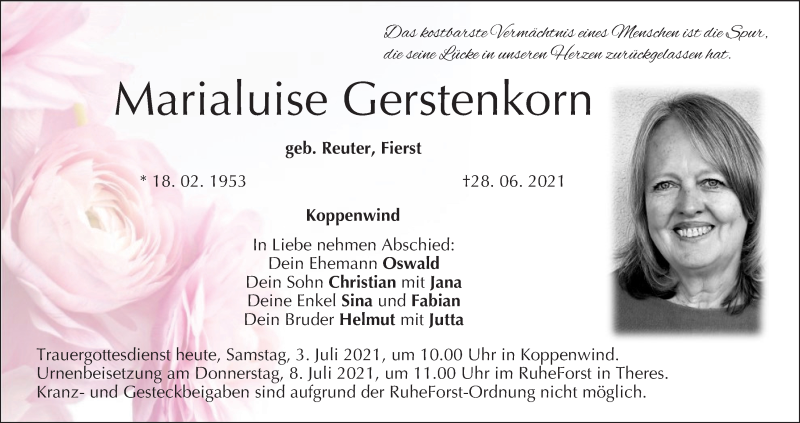 Hier finden Sie alle Traueranzeigen aus der Zeitung, die bisher für Marialuise Gerstenkorn erschienen sind. Weitere Traueranzeigen, die in der Zeitung erscheinen, werden hier ebenfalls aufgelistet