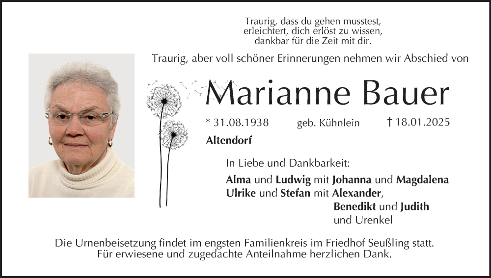Hier finden Sie alle Traueranzeigen aus der Zeitung, die bisher für Marianne Bauer erschienen sind. Weitere Traueranzeigen, die in der Zeitung erscheinen, werden hier ebenfalls aufgelistet