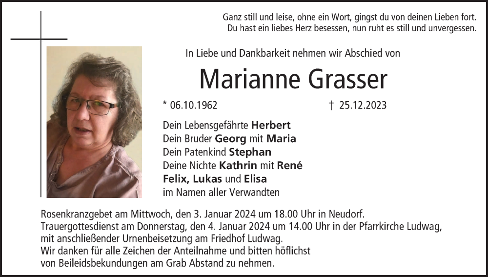 Hier finden Sie alle Traueranzeigen aus der Zeitung, die bisher für Marianne Grasser erschienen sind. Weitere Traueranzeigen, die in der Zeitung erscheinen, werden hier ebenfalls aufgelistet