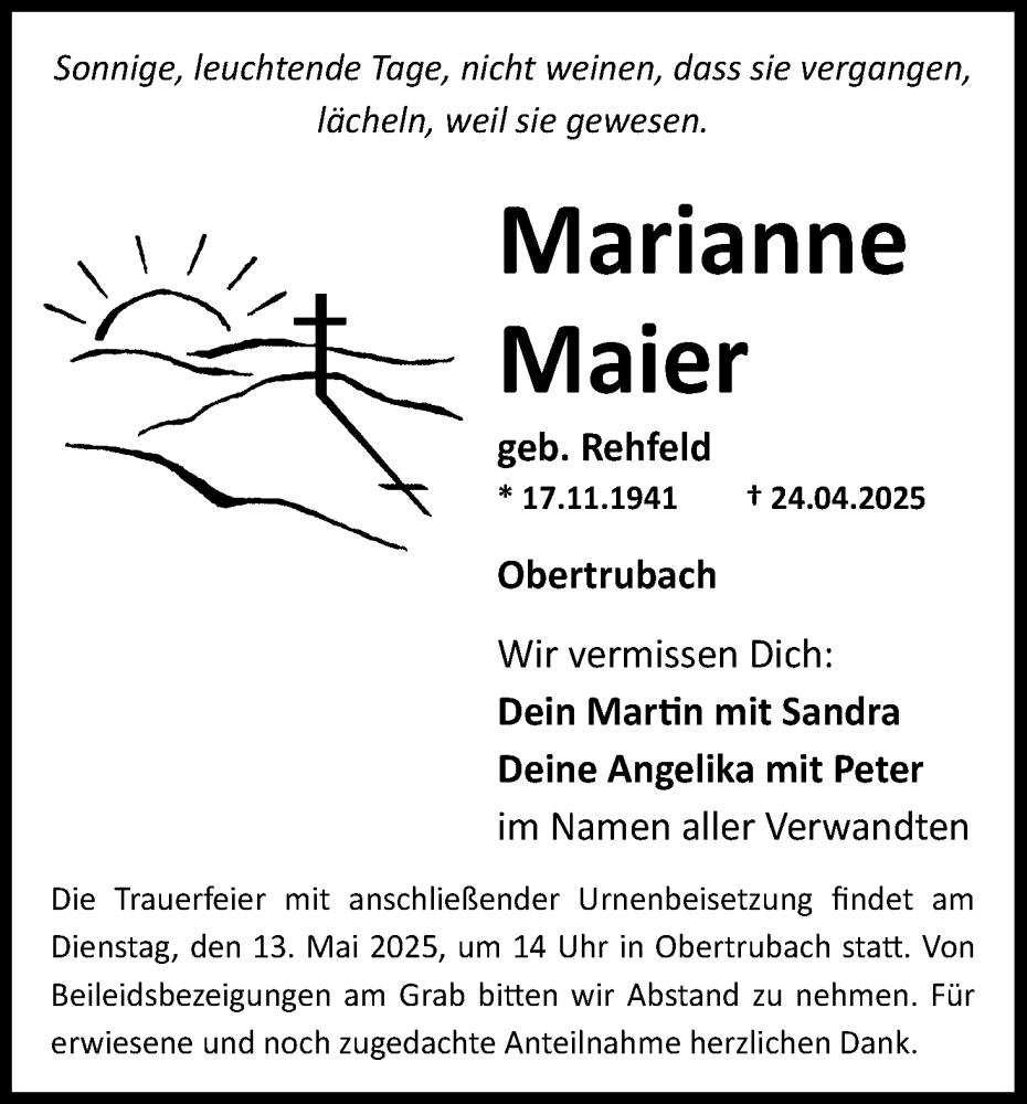 Hier finden Sie alle Traueranzeigen aus der Zeitung, die bisher für Marianne Maier erschienen sind. Weitere Traueranzeigen, die in der Zeitung erscheinen, werden hier ebenfalls aufgelistet