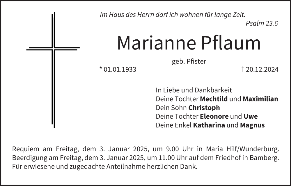 Hier finden Sie alle Traueranzeigen aus der Zeitung, die bisher für Marianne Pflaum erschienen sind. Weitere Traueranzeigen, die in der Zeitung erscheinen, werden hier ebenfalls aufgelistet